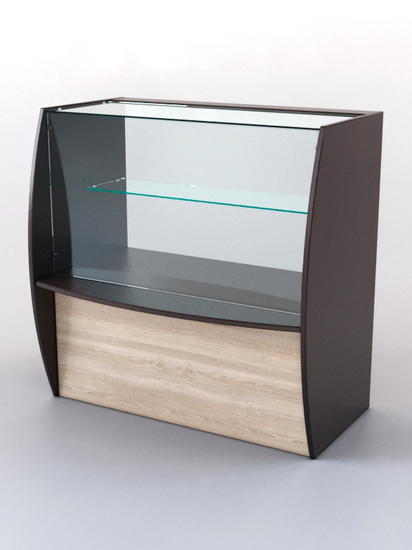 Каркас прилавка выполнен из ЛДСП. Корпус и полка витрины — стеклянные.