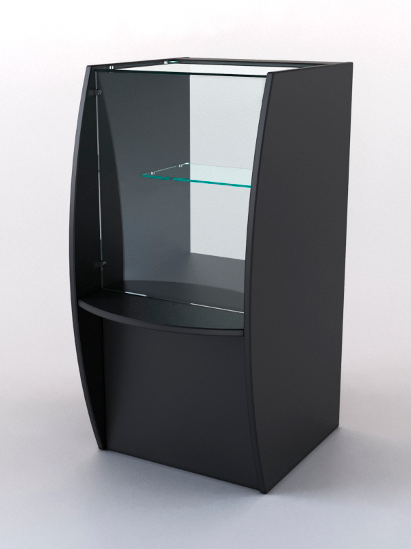 Конструкция содержит стеклянную витрину с полкой и накопитель. Витрина и накопитель открыты с внутренней стороны прилавка. На передней панели имеется удобная полка для размещения сумок.