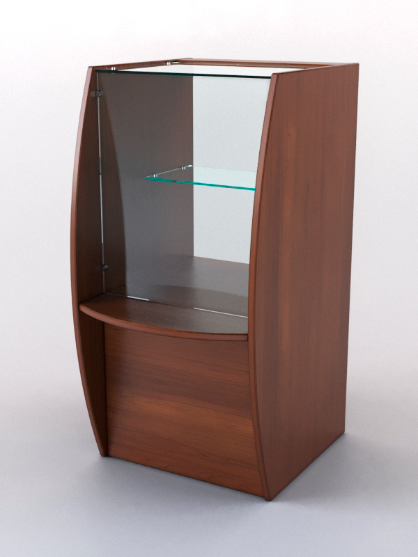 Конструкция содержит стеклянную витрину с полкой и накопитель. Витрина и накопитель открыты с внутренней стороны прилавка. На передней панели имеется удобная полка для размещения сумок.