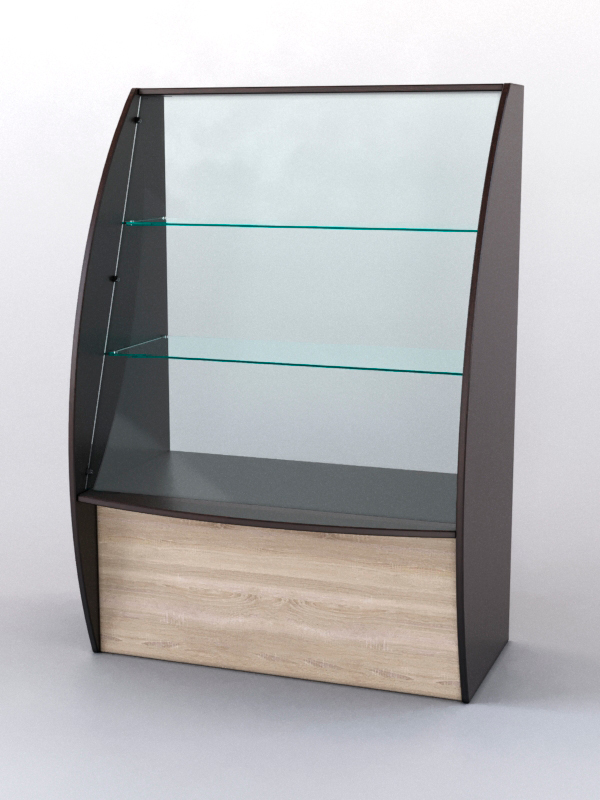 Конструкция содержит стеклянную витрину с двумя полками и накопитель. Витрина и накопитель открыты с внутренней стороны прилавка. На передней панели имеется удобная полка для размещения сумок.