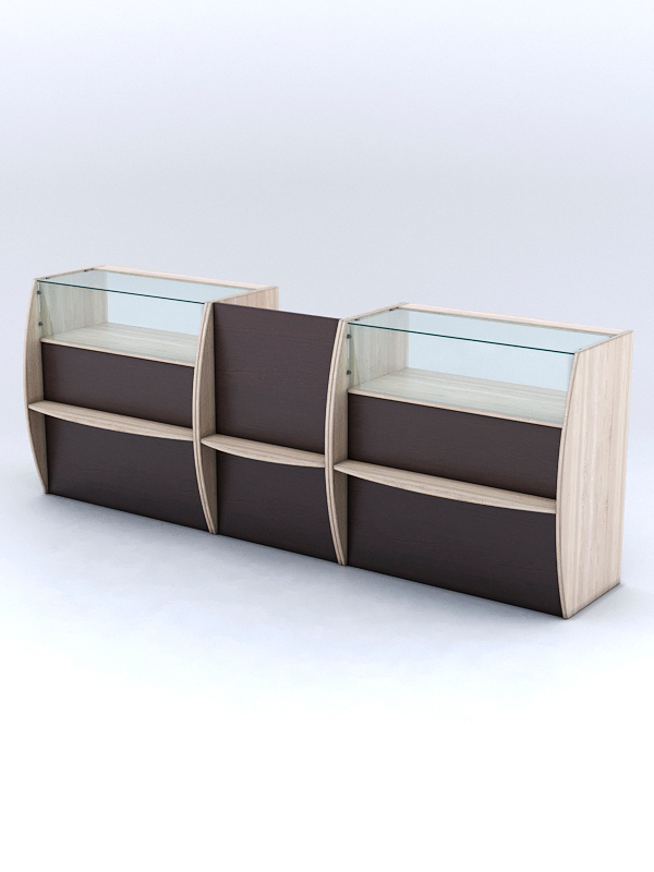 Конструкция представляет собой комбинацию двух прилавков с витриной и кассового прилавка.