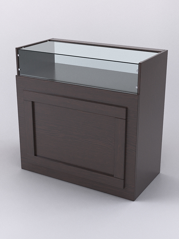 Прилавок предназначен для выкладки и хранения сувениров, предметов декора, парфюмерии, бижутерии. Конструкция прилавка включает витрину. С внутренней стороны имеются две полки. Фасад декорирован прямоугольником контрастного цвета. Каркас выполнен из ЛДСП, стенка и крыша витрины — стеклянные. Имеется семь стандартных расцветок. Другие цвета подбираются в палитре на заказ.