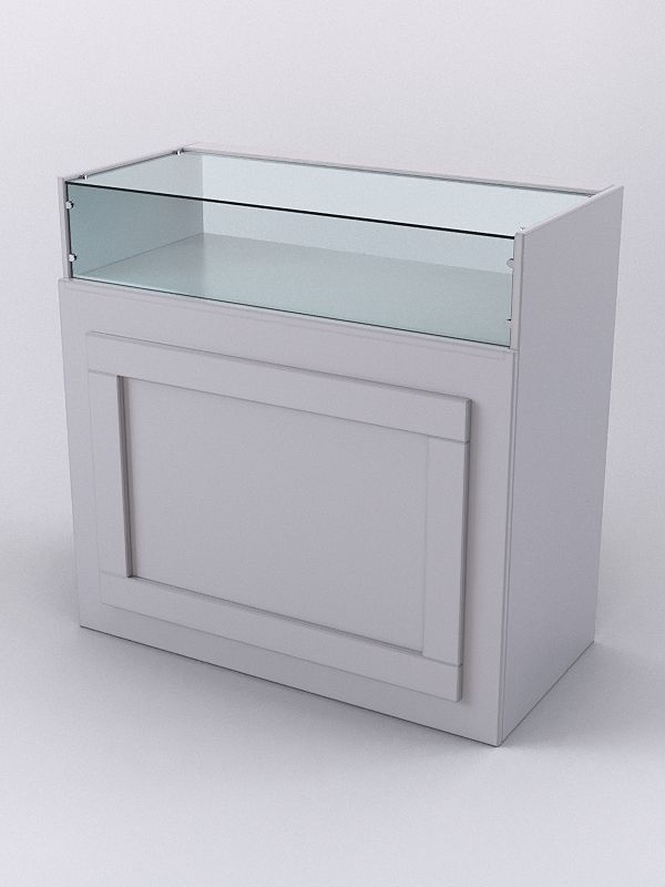 Прилавок предназначен для выкладки и хранения сувениров, предметов декора, парфюмерии, бижутерии. Конструкция прилавка включает витрину. С внутренней стороны имеются две полки. Фасад декорирован прямоугольником контрастного цвета. Каркас выполнен из ЛДСП, стенка и крыша витрины — стеклянные. Имеется семь стандартных расцветок. Другие цвета подбираются в палитре на заказ.