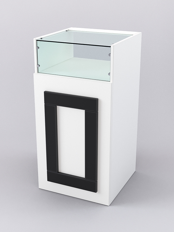 Прилавок предназначен для выкладки и хранения сувениров, предметов декора, парфюмерии, бижутерии. Конструкция прилавка включает витрину. С внутренней стороны имеются две полки. Фасад декорирован прямоугольником контрастного цвета. Каркас выполнен из ЛДСП, стенка и крыша витрины — стеклянные. Имеется семь стандартных расцветок. Другие цвета подбираются в палитре на заказ.