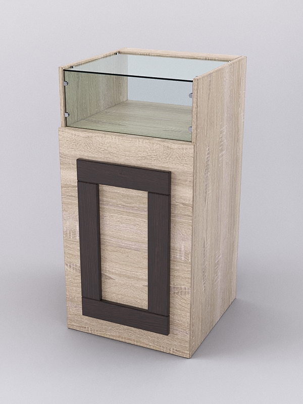 Прилавок предназначен для выкладки и хранения сувениров, предметов декора, парфюмерии, бижутерии. Конструкция прилавка включает витрину. С внутренней стороны имеются две полки. Фасад декорирован прямоугольником контрастного цвета. Каркас выполнен из ЛДСП, стенка и крыша витрины — стеклянные. Имеется семь стандартных расцветок. Другие цвета подбираются в палитре на заказ.