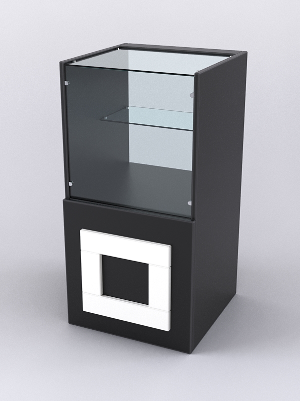Прилавок предназначен для выкладки и хранения сувениров, предметов декора, парфюмерии, бижутерии. Конструкция прилавка включает витрину с полкой. С внутренней стороны имеется отсек для хранения. Фасад декорирован квадратом контрастного цвета. Каркас выполнен из ЛДСП, стенка, полка и крыша витрины — стеклянные. Имеется семь стандартных расцветок. Другие цвета подбираются в палитре на заказ.