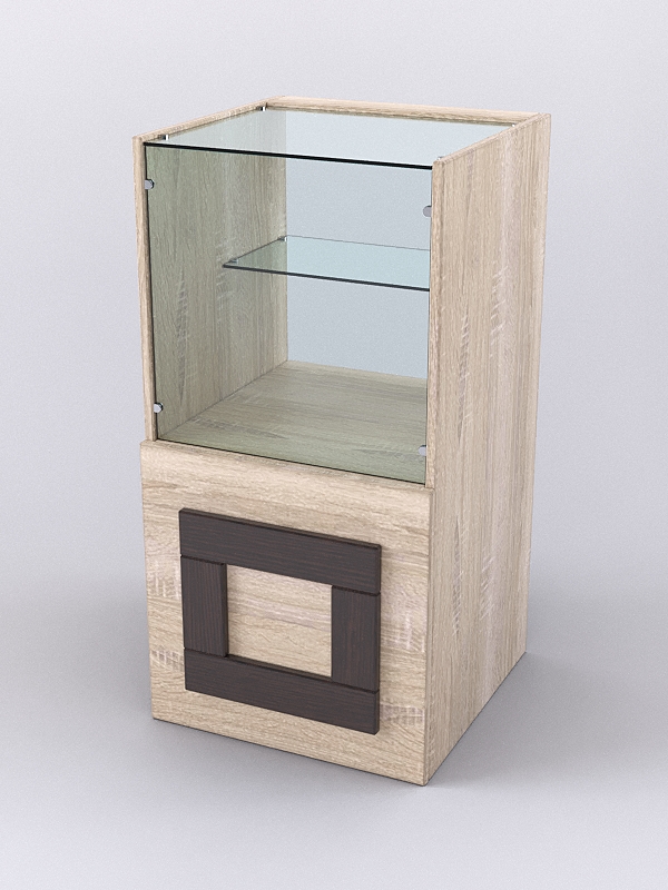 Прилавок предназначен для выкладки и хранения сувениров, предметов декора, парфюмерии, бижутерии. Конструкция прилавка включает витрину с полкой. С внутренней стороны имеется отсек для хранения. Фасад декорирован квадратом контрастного цвета. Каркас выполнен из ЛДСП, стенка, полка и крыша витрины — стеклянные. Имеется семь стандартных расцветок. Другие цвета подбираются в палитре на заказ.