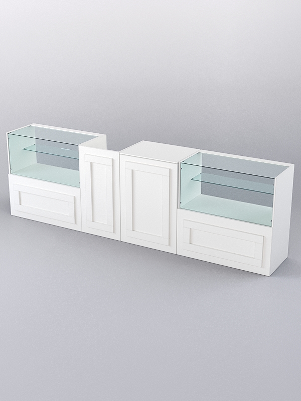 В комплект входят прилавки с витриной, кассовый и откидной прилавки.