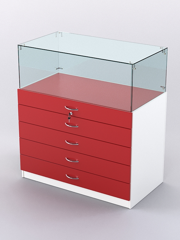 Накопитель оборудован четырьмя выдвижными ящиками. Пятым выдвижным ящиком является полка витрины. Ящик с полкой закрываются на ключ.