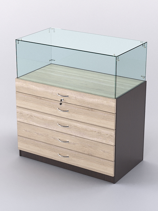 Накопитель оборудован четырьмя выдвижными ящиками. Пятым выдвижным ящиком является полка витрины. Ящик с полкой закрываются на ключ.