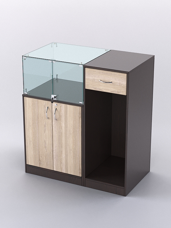 Прилавок из серии Риволи идеально подходит для эффектных украшений, аксессуаров, дорогих сувениров и других изысканных товаров. Состоит из двух частей. Одна — это витрина с задней стенкой из стекла. Вторая — кассовый стол для работы с клиентами