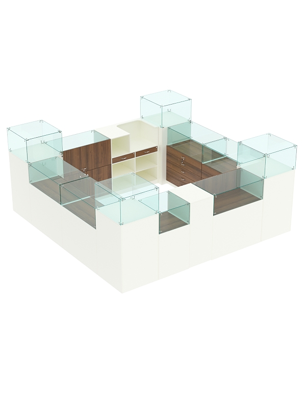 В ограниченной выделенной зоне вы можете разместить ювелирные украшения, салон сотовой связи и любые другие премиальные товары. Предусмотрены прилавки со стеклянным куполом и витрины из стекла для эффективной демонстрации предметов, закрытые тумбы с распашными дверками и выдвижные ящики для удобного хранения упаковки и инвентаря. Есть кассовый стол для комфортного обслуживания клиентов.