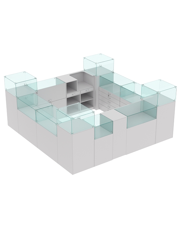 В ограниченной выделенной зоне вы можете разместить ювелирные украшения, салон сотовой связи и любые другие премиальные товары. Предусмотрены прилавки со стеклянным куполом и витрины из стекла для эффективной демонстрации предметов, закрытые тумбы с распашными дверками и выдвижные ящики для удобного хранения упаковки и инвентаря. Есть кассовый стол для комфортного обслуживания клиентов.