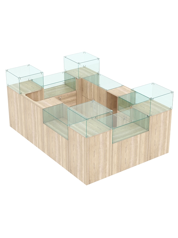 В ограниченной выделенной зоне вы можете разместить ювелирные украшения, салон сотовой связи и любые другие премиальные товары. Предусмотрены прилавки со стеклянным куполом и витрины из стекла для эффективной демонстрации предметов, закрытые тумбы с распашными дверками и выдвижные ящики для удобного хранения упаковки и инвентаря. Есть кассовый стол для комфортного обслуживания клиентов.