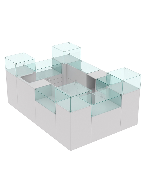 В ограниченной выделенной зоне вы можете разместить ювелирные украшения, салон сотовой связи и любые другие премиальные товары. Предусмотрены прилавки со стеклянным куполом и витрины из стекла для эффективной демонстрации предметов, закрытые тумбы с распашными дверками и выдвижные ящики для удобного хранения упаковки и инвентаря. Есть кассовый стол для комфортного обслуживания клиентов.