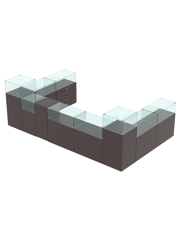В ограниченной выделенной зоне вы можете разместить ювелирные украшения, салон сотовой связи и любые другие премиальные товары. Предусмотрены прилавки со стеклянным куполом и витрины из стекла для эффективной демонстрации предметов, закрытые тумбы с распашными дверками и выдвижные ящики для удобного хранения упаковки и инвентаря. На столах есть место для кассовой зоны