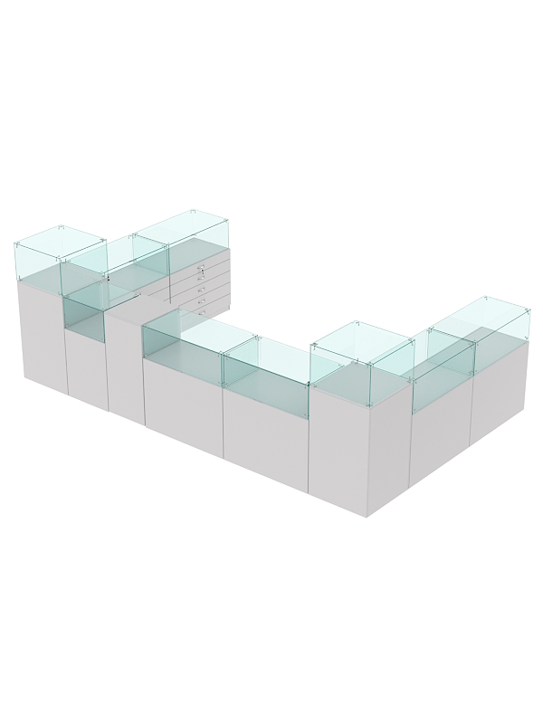В ограниченной выделенной зоне вы можете разместить ювелирные украшения, салон сотовой связи и любые другие премиальные товары. Предусмотрены прилавки со стеклянным куполом и витрины из стекла для эффективной демонстрации предметов, закрытые тумбы с распашными дверками и выдвижные ящики для удобного хранения упаковки и инвентаря. На столах есть место для кассовой зоны