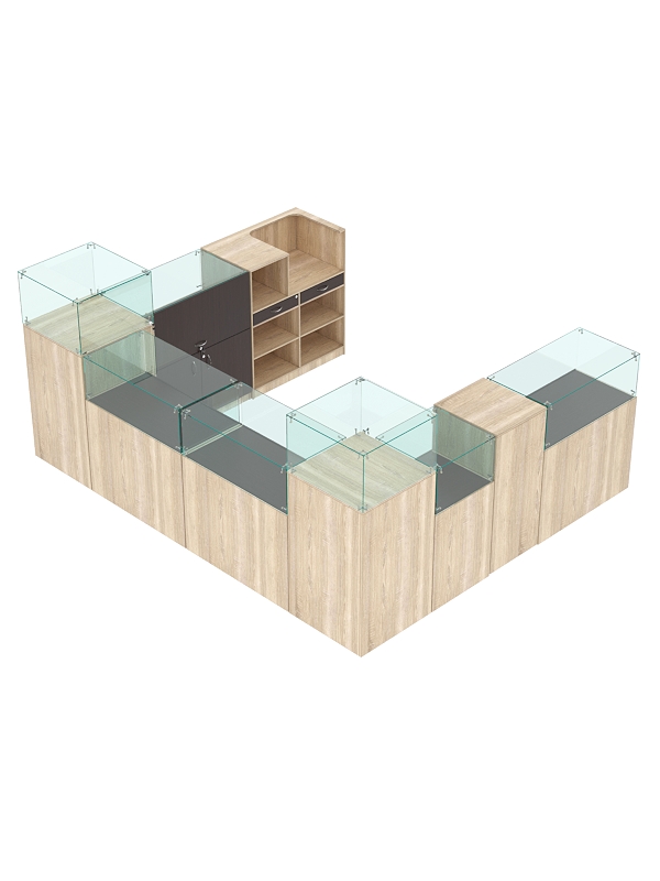 В ограниченной выделенной зоне вы можете разместить ювелирные украшения, салон сотовой связи и любые другие премиальные товары. Предусмотрены прилавки со стеклянным куполом и витрины из стекла для эффективной демонстрации предметов, закрытые тумбы с распашными дверками и выдвижные ящики для удобного хранения упаковки и инвентаря. На столах есть место для кассовой зоны