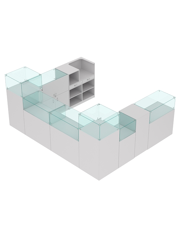 В ограниченной выделенной зоне вы можете разместить ювелирные украшения, салон сотовой связи и любые другие премиальные товары. Предусмотрены прилавки со стеклянным куполом и витрины из стекла для эффективной демонстрации предметов, закрытые тумбы с распашными дверками и выдвижные ящики для удобного хранения упаковки и инвентаря. На столах есть место для кассовой зоны