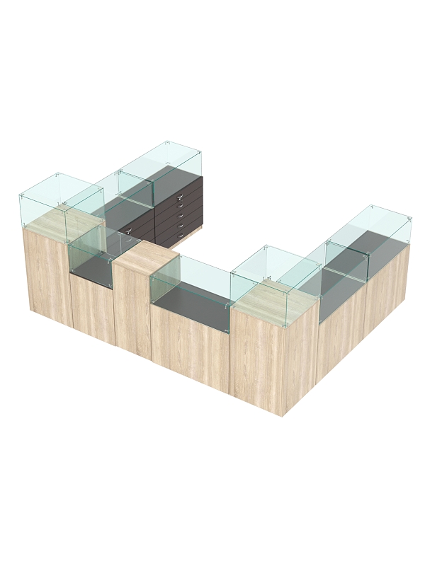 В ограниченной выделенной зоне вы можете разместить ювелирные украшения, салон сотовой связи и любые другие премиальные товары. Предусмотрены прилавки со стеклянным куполом и витрины из стекла для эффективной демонстрации предметов, закрытые тумбы с распашными дверками и выдвижные ящики для удобного хранения упаковки и инвентаря. На столах есть место для кассовой зоны