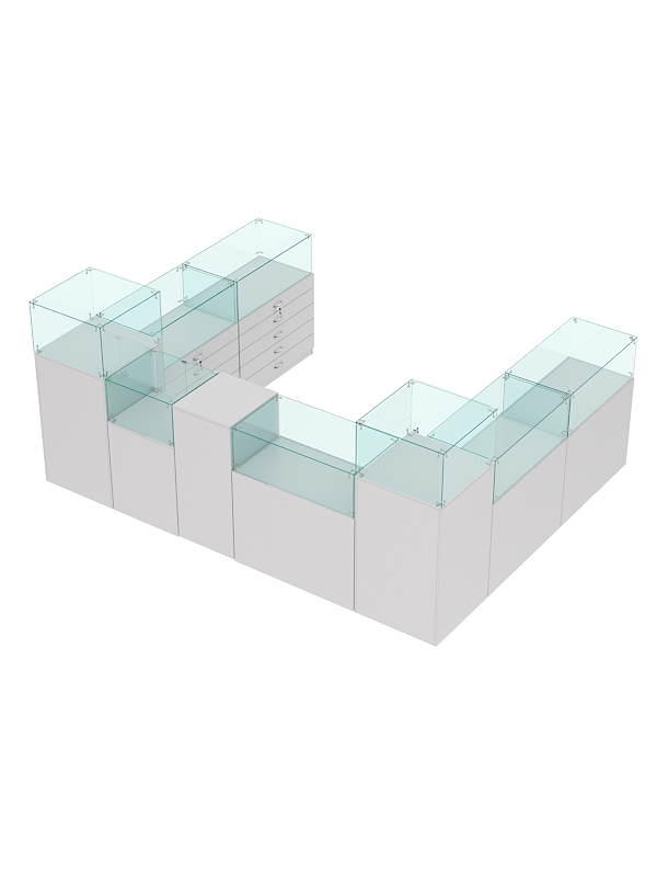 В ограниченной выделенной зоне вы можете разместить ювелирные украшения, салон сотовой связи и любые другие премиальные товары. Предусмотрены прилавки со стеклянным куполом и витрины из стекла для эффективной демонстрации предметов, закрытые тумбы с распашными дверками и выдвижные ящики для удобного хранения упаковки и инвентаря. На столах есть место для кассовой зоны