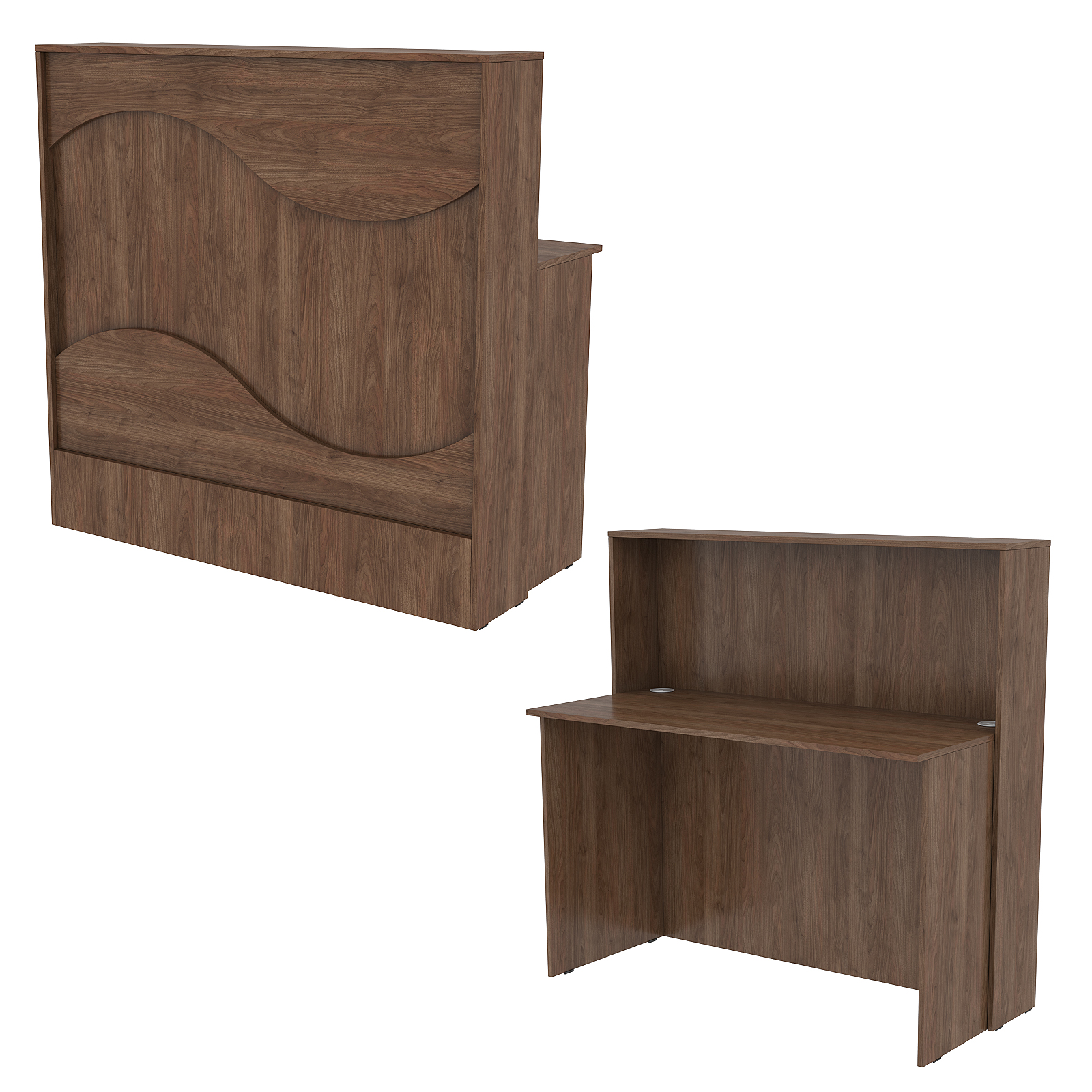 Конструкция состоит из двух предметов: стойки с верхней столешницей и рабочего стола администратора. Каркас выполнен из ЛДСП темного тона. Фасад отделан ЛДСП панелью, имитирующей волну океана. Материал обладает приятными тактильными свойствами и рельефной фактурой. Для данной модели выбран светлый тон.