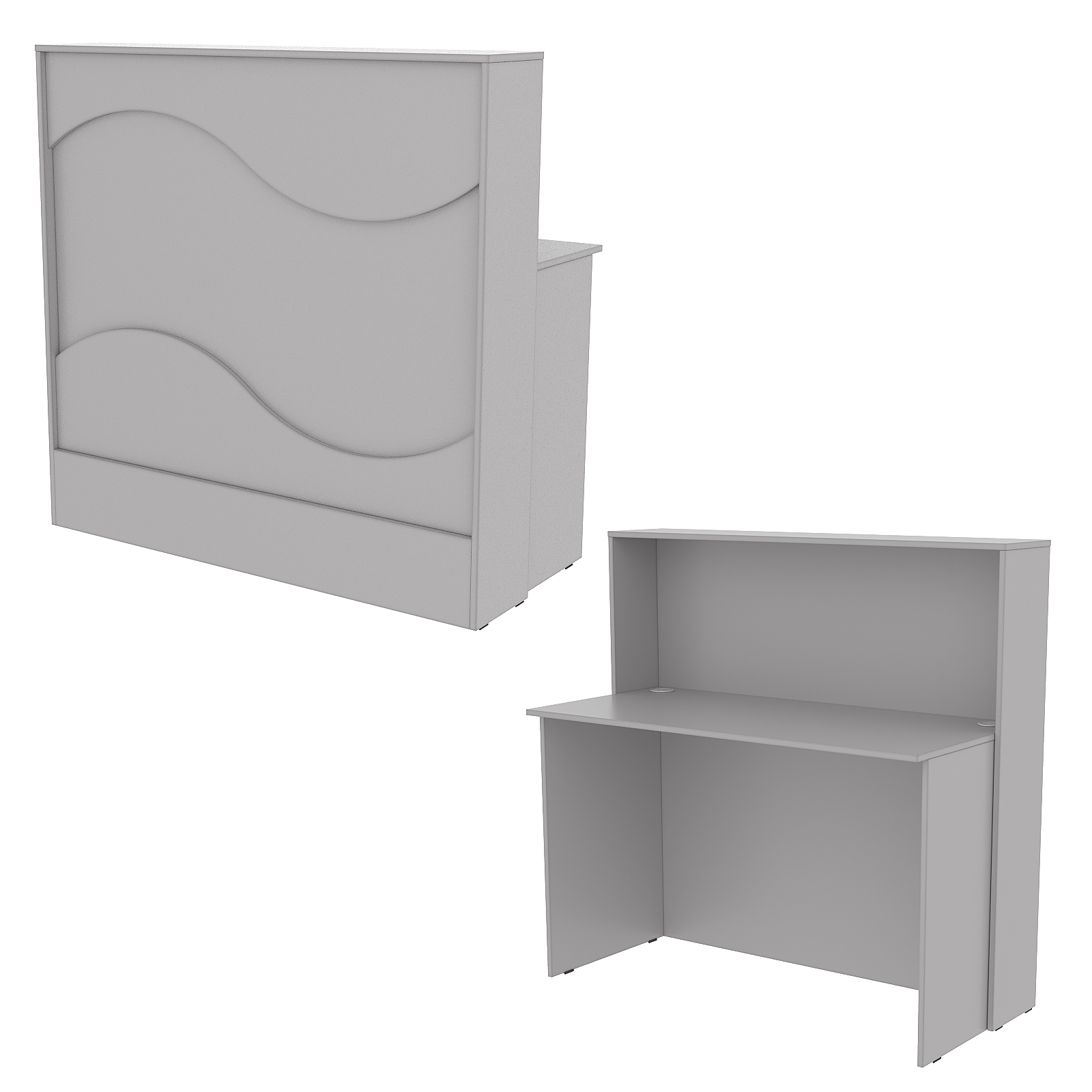 Конструкция состоит из двух предметов: стойки с верхней столешницей и рабочего стола администратора. Каркас выполнен из ЛДСП темного тона. Фасад отделан ЛДСП панелью, имитирующей волну океана. Материал обладает приятными тактильными свойствами и рельефной фактурой. Для данной модели выбран светлый тон.