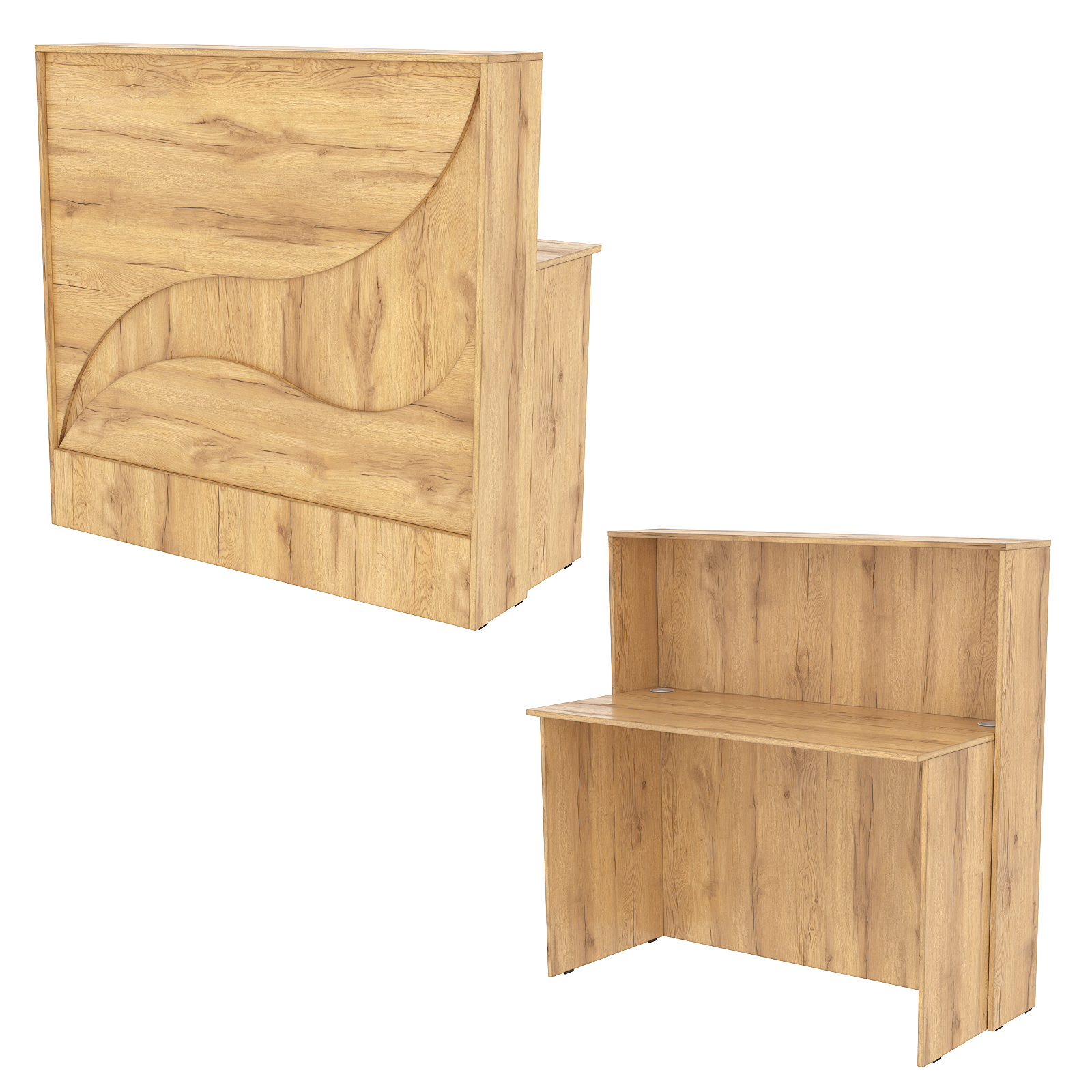 Конструкция состоит из двух предметов: стойки с верхней столешницей и рабочего стола администратора. Каркас выполнен из ЛДСП темного тона. Фасад отделан ЛДСП панелью, имитирующей волну океана. Материал обладает приятными тактильными свойствами и рельефной фактурой.