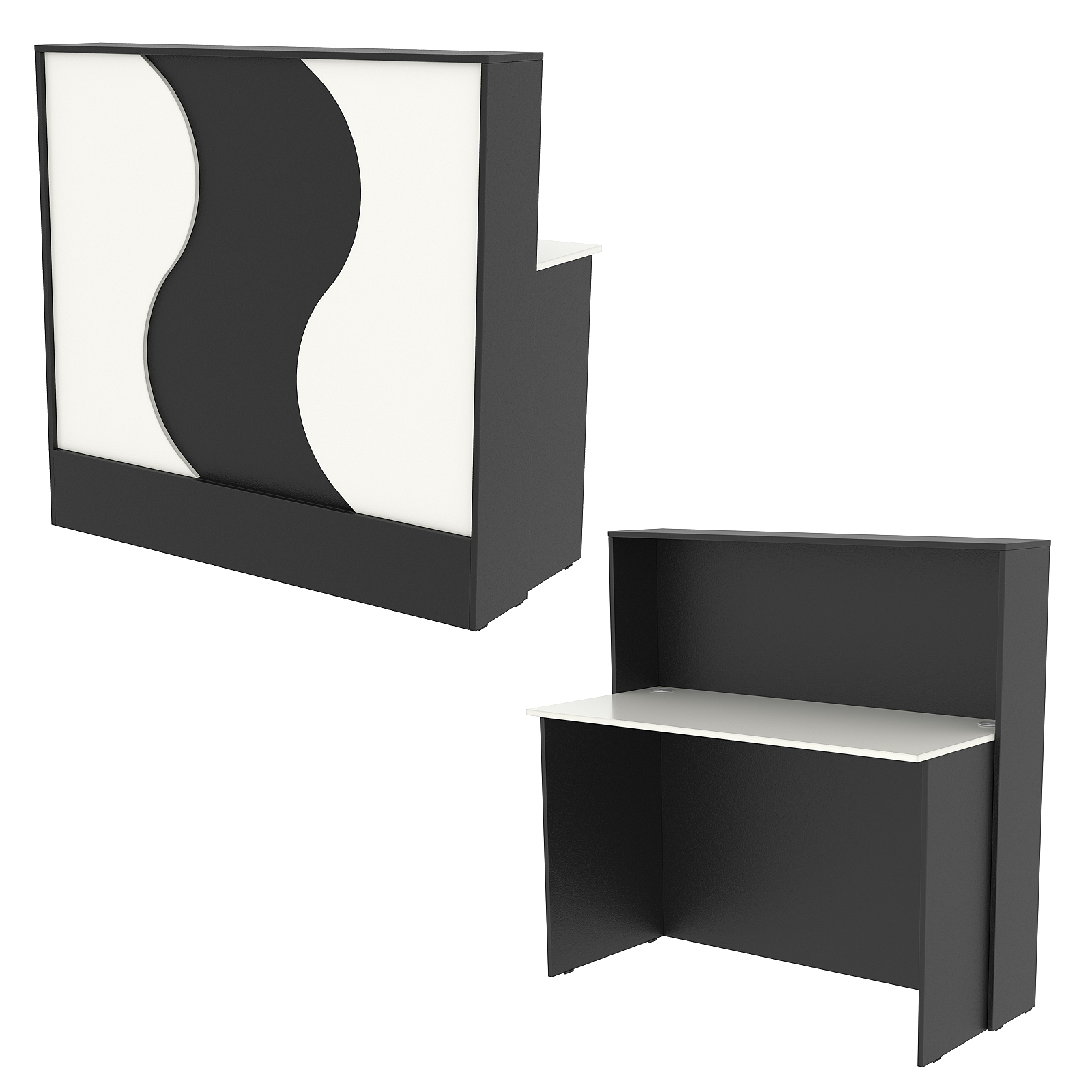Конструкция состоит из двух предметов: стойки с верхней столешницей и рабочего стола администратора. Каркас выполнен из ЛДСП темного тона. Фасад отделан ЛДСП панелью, имитирующей волну океана. Материал обладает приятными тактильными свойствами и рельефной фактурой.