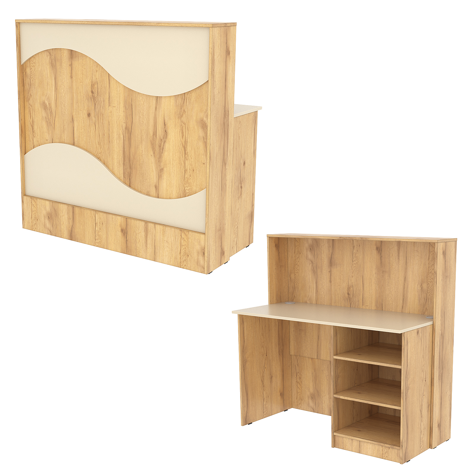 Конструкция состоит из двух предметов: стойки с верхней столешницей и рабочего стола администратора. Стол администратора содержит тумбу с тремя отделениями, расположенную справа. Каркас выполнен из ЛДСП темного тона. Фасад отделан ЛДСП панелью, имитирующей волну океана. Материал обладает приятными тактильными свойствами и рельефной фактурой.