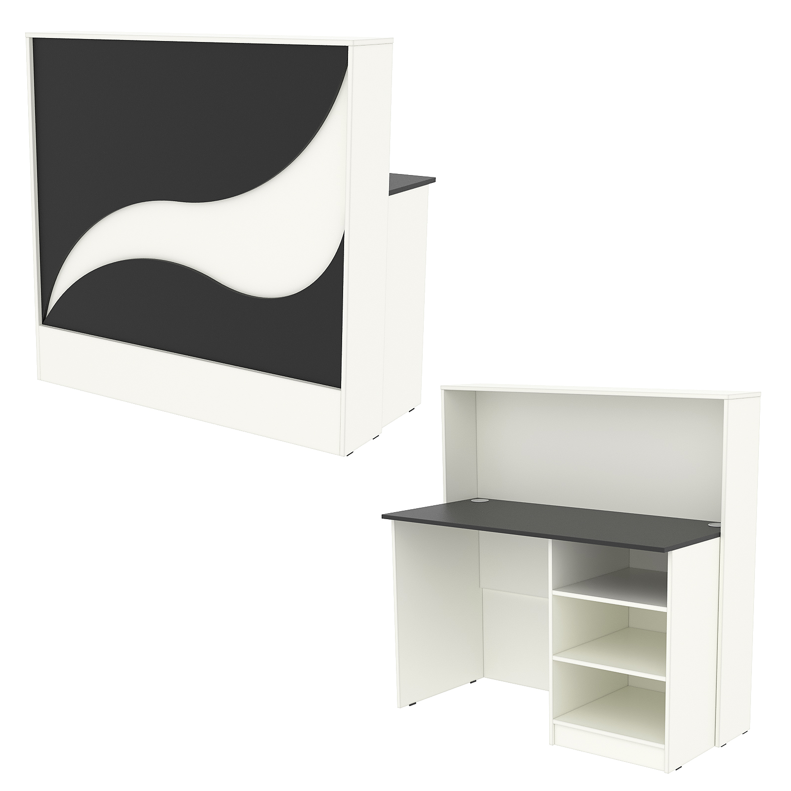 Конструкция состоит из двух предметов: стойки с верхней столешницей и рабочего стола администратора. Стол администратора содержит тумбу с тремя отделениями, расположенную справа. Каркас выполнен из ЛДСП темного тона. Фасад отделан ЛДСП панелью, имитирующей волну океана. Материал обладает приятными тактильными свойствами и рельефной фактурой.