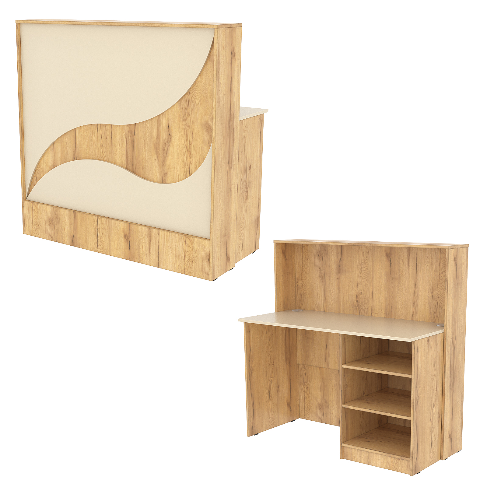 Конструкция состоит из двух предметов: стойки с верхней столешницей и рабочего стола администратора. Стол администратора содержит тумбу с тремя отделениями, расположенную справа. Каркас выполнен из ЛДСП темного тона. Фасад отделан ЛДСП панелью, имитирующей волну океана. Материал обладает приятными тактильными свойствами и рельефной фактурой.