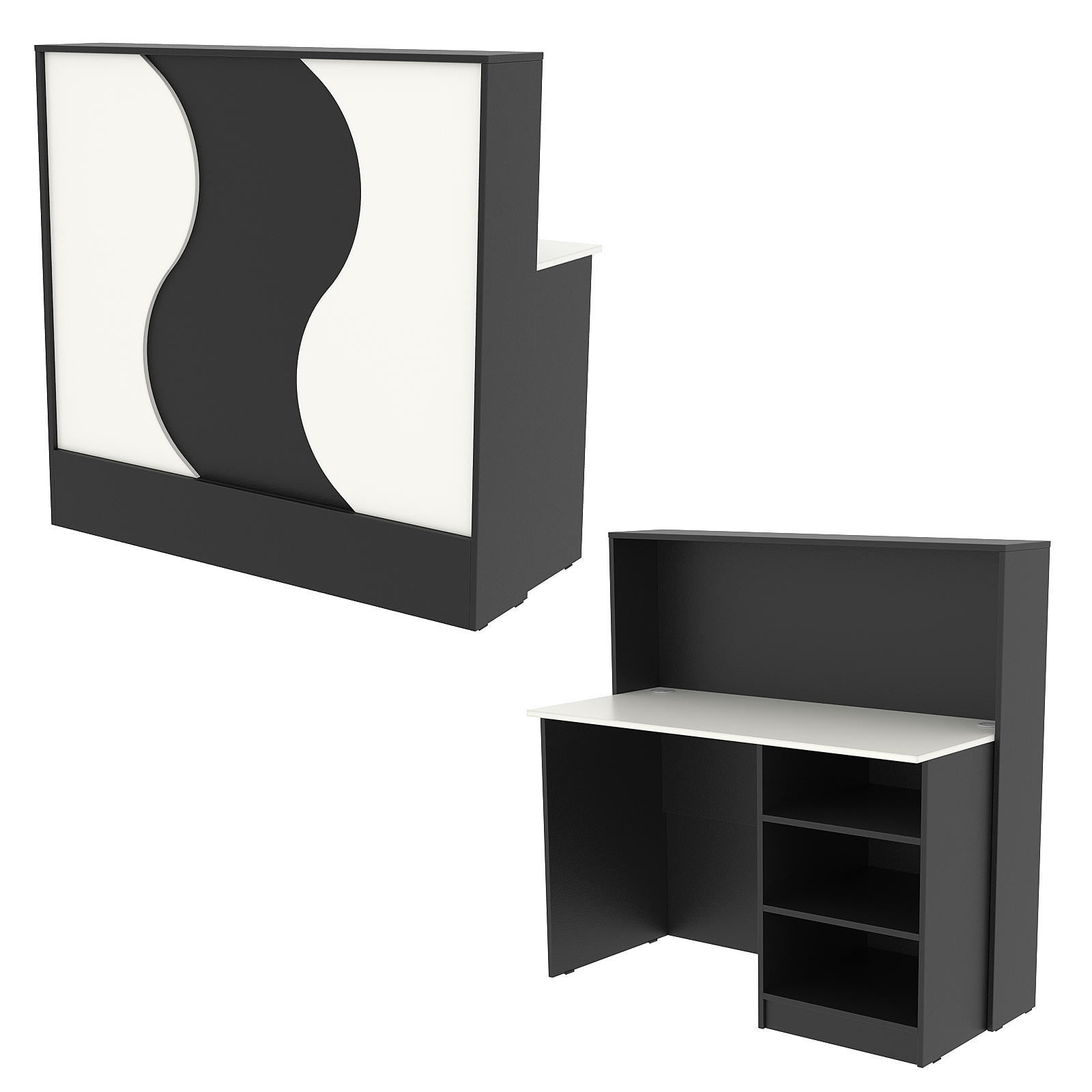 Конструкция состоит из двух предметов: стойки с верхней столешницей и рабочего стола администратора. Стол администратора содержит тумбу с тремя отделениями, расположенную справа. Каркас выполнен из ЛДСП темного тона. Фасад отделан ЛДСП панелью, имитирующей волну океана. Материал обладает приятными тактильными свойствами и рельефной фактурой.