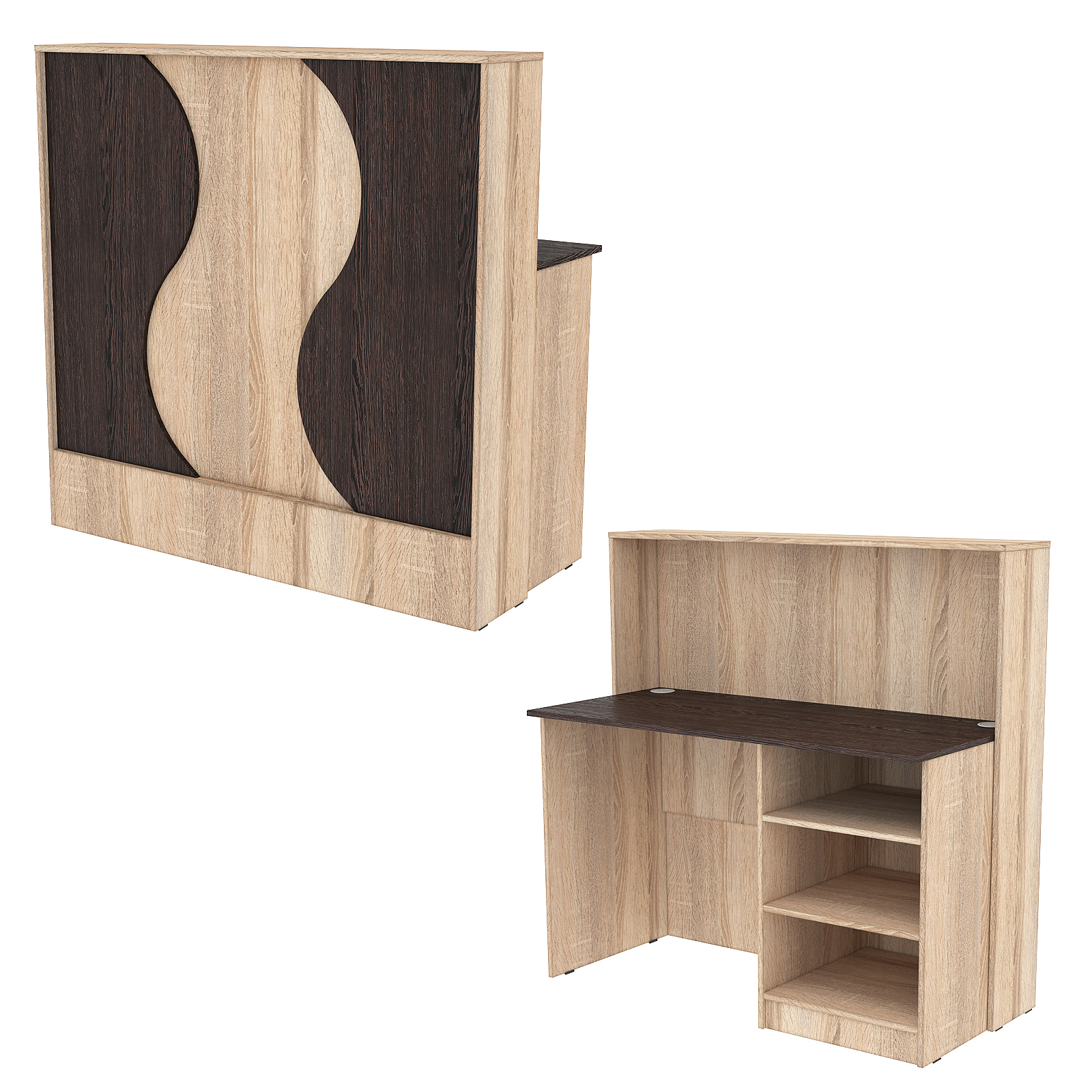 Конструкция состоит из двух предметов: стойки с верхней столешницей и рабочего стола администратора. Стол администратора содержит тумбу с тремя отделениями, расположенную справа. Каркас выполнен из ЛДСП темного тона. Фасад отделан ЛДСП панелью, имитирующей волну океана. Материал обладает приятными тактильными свойствами и рельефной фактурой.