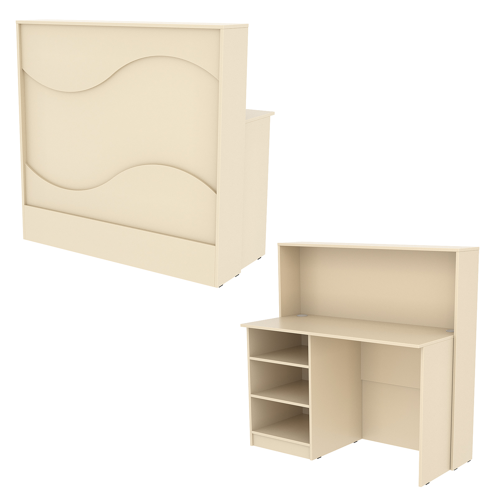 Конструкция состоит из двух предметов: стойки с верхней столешницей и рабочего стола администратора. Стол администратора содержит тумбу с тремя отделениями, расположенную слева. Каркас выполнен из ЛДСП темного тона. Фасад отделан ЛДСП панелью, имитирующей волну океаана. Материал обладает приятными тактильными свойствами и рельефной фактурой.