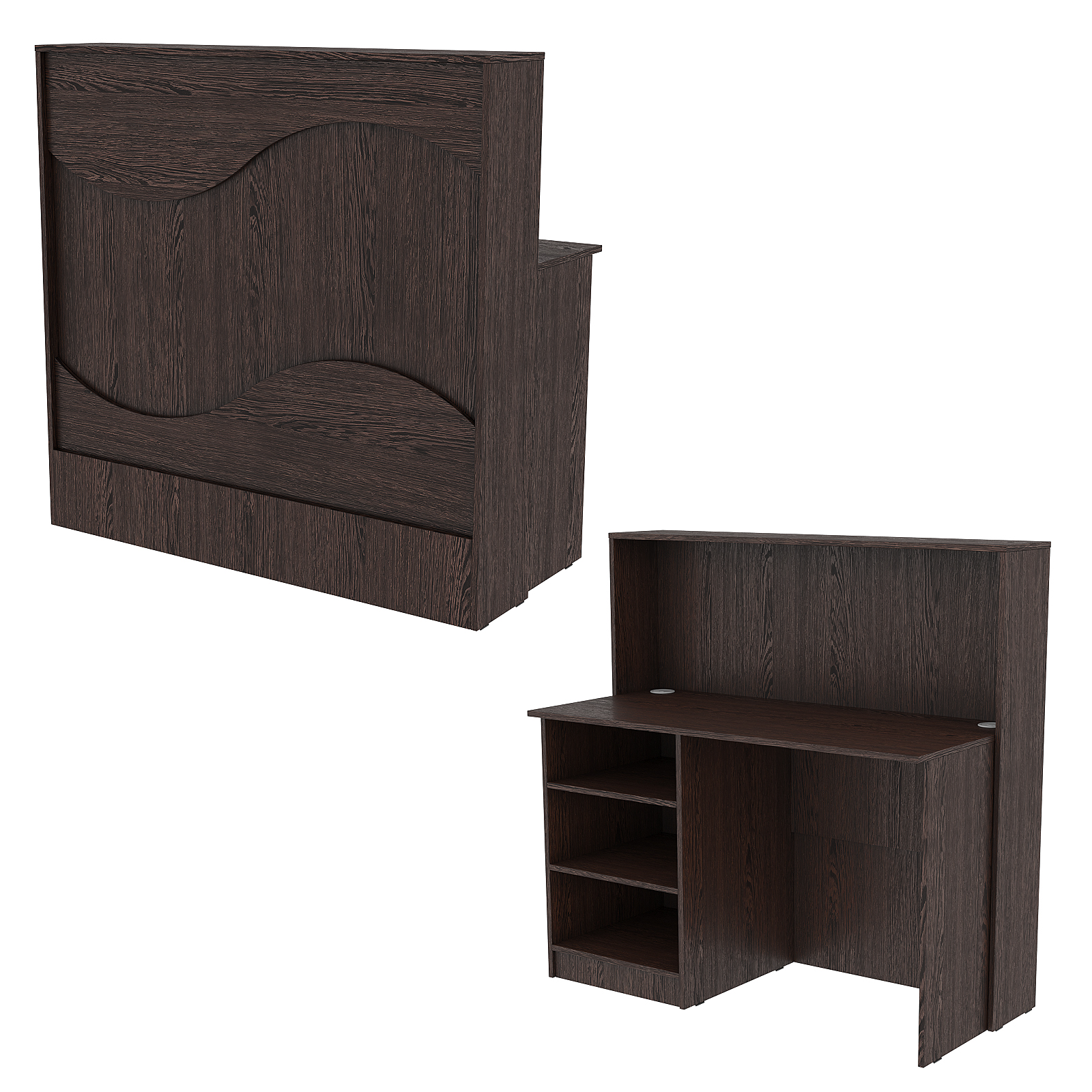 Конструкция состоит из двух предметов: стойки с верхней столешницей и рабочего стола администратора. Стол администратора содержит тумбу с тремя отделениями, расположенную слева. Каркас выполнен из ЛДСП темного тона. Фасад отделан ЛДСП панелью, имитирующей волну океаана. Материал обладает приятными тактильными свойствами и рельефной фактурой.
