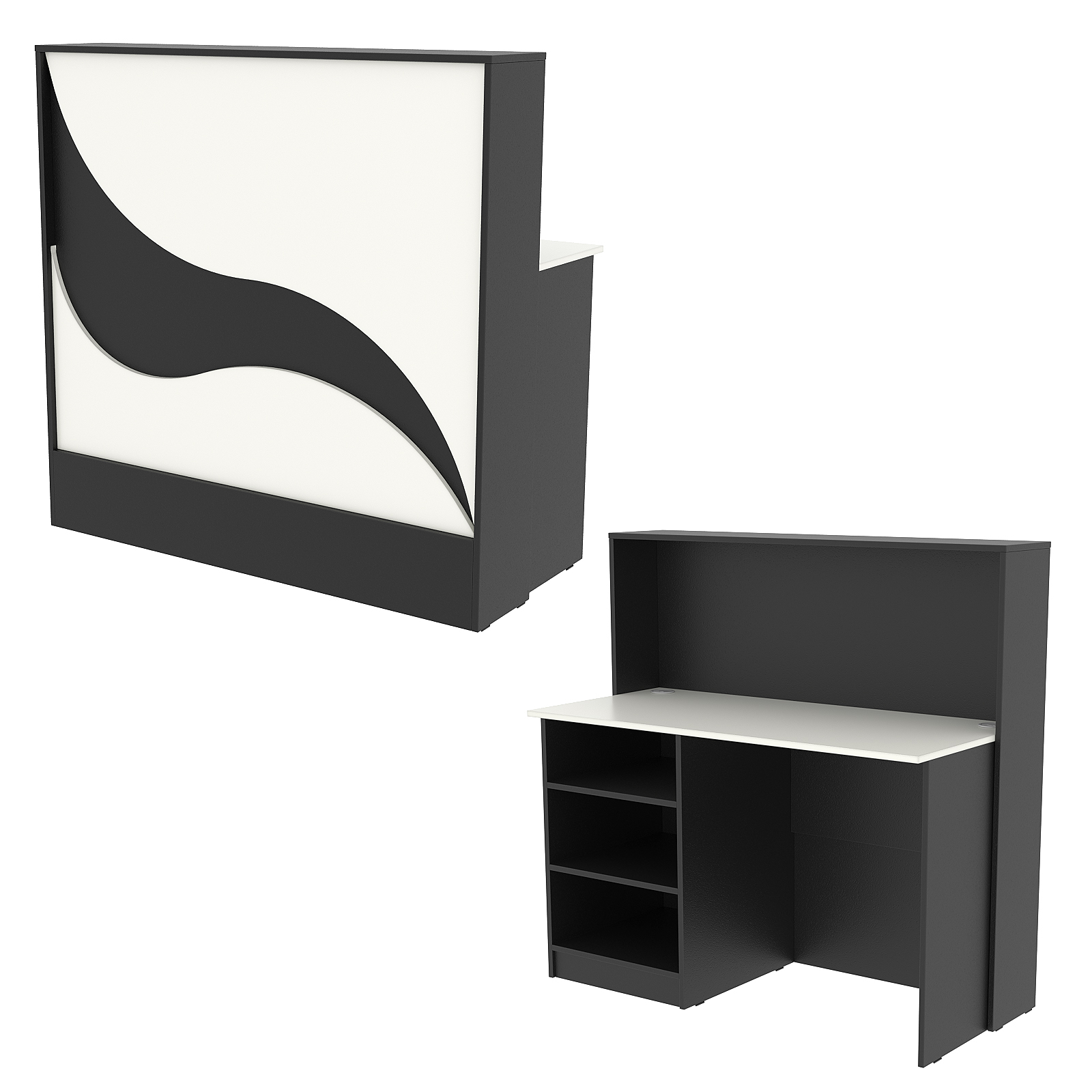 Конструкция состоит из двух предметов: стойки с верхней столешницей и рабочего стола администратора. Стол администратора содержит тумбу с тремя отделениями, расположенную слева. Каркас выполнен из ЛДСП темного тона. Фасад отделан ЛДСП панелью, имитирующей волну океана. Материал обладает приятными тактильными свойствами и рельефной фактурой.