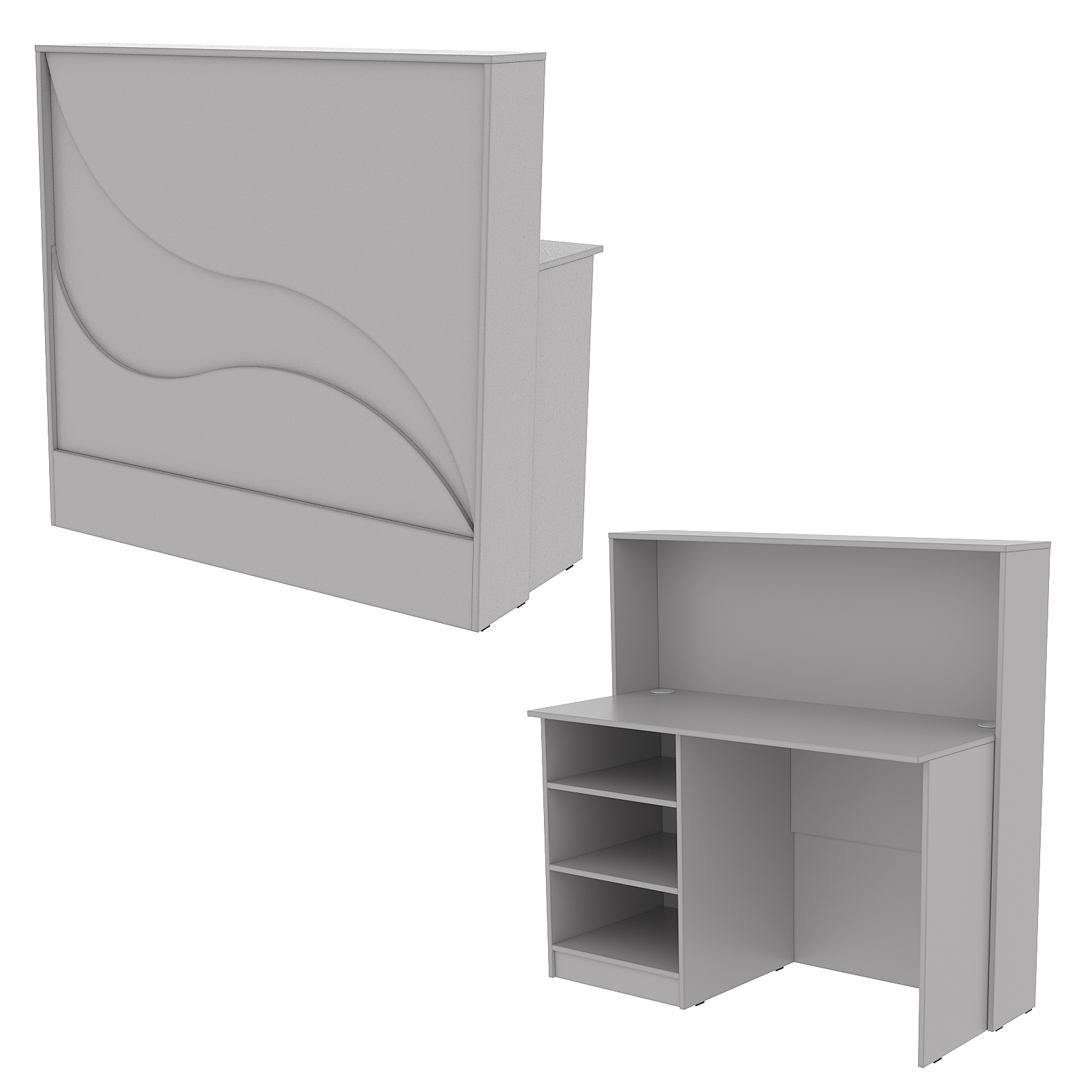 Конструкция состоит из двух предметов: стойки с верхней столешницей и рабочего стола администратора. Стол администратора содержит тумбу с тремя отделениями, расположенную слева. Каркас выполнен из ЛДСП темного тона. Фасад отделан ЛДСП панелью, имитирующей волну океана. Материал обладает приятными тактильными свойствами и рельефной фактурой.