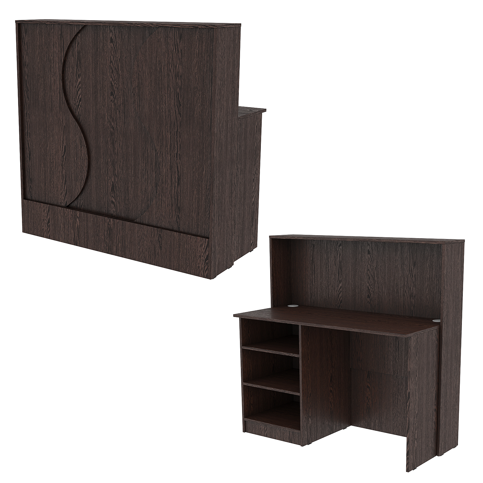 Конструкция состоит из двух предметов: стойки с верхней столешницей и рабочего стола администратора. Стол администратора содержит тумбу с тремя отделениями, расположенную слева. Каркас выполнен из ЛДСП темного тона. Фасад отделан ЛДСП панелью, имитирующей волну океана. Материал обладает приятными тактильными свойствами и рельефной фактурой.