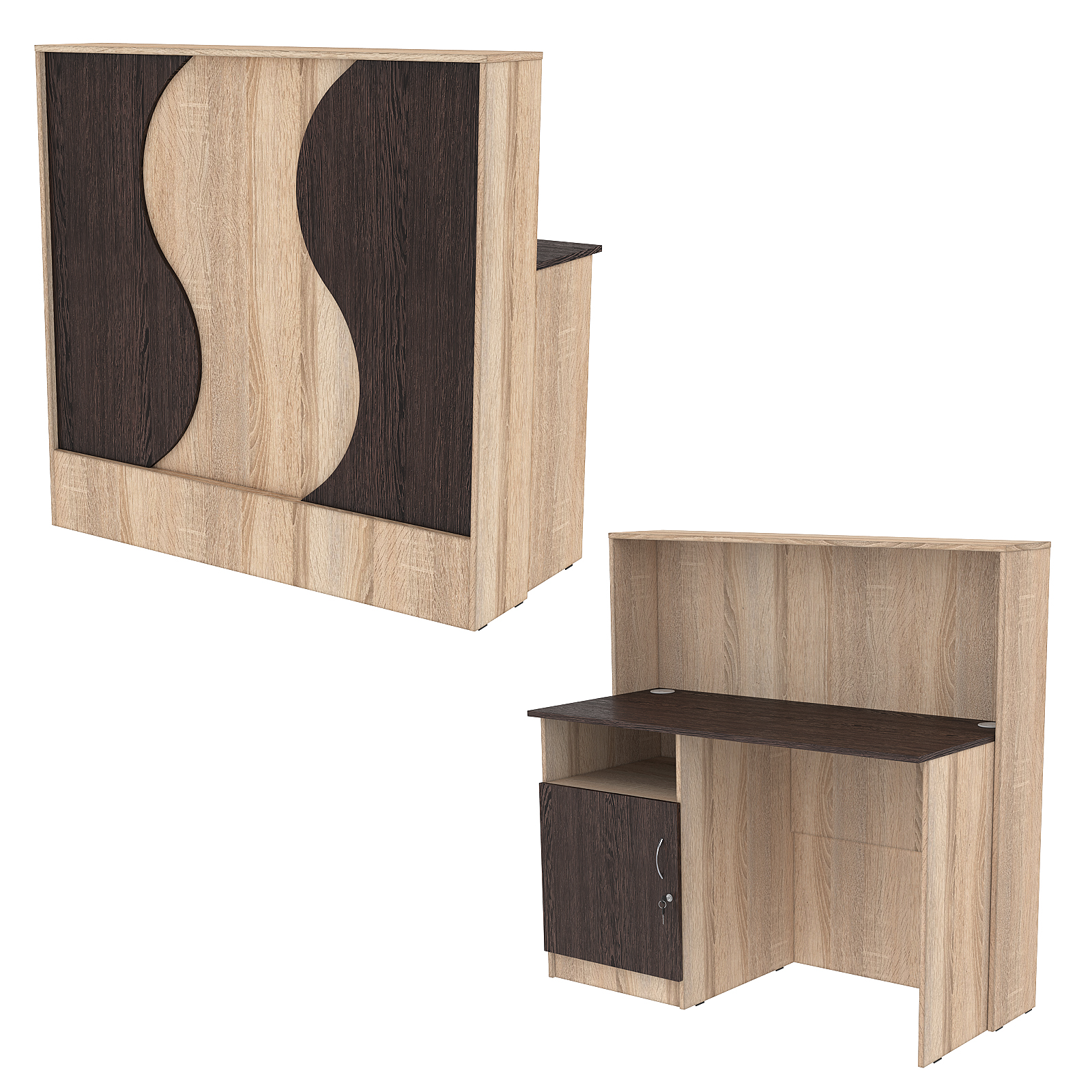 Конструкция состоит из двух предметов: стойки с верхней столешницей и рабочего стола администратора. Стол администратора содержит тумбу с тремя отделениями, расположенную слева. Верхнее отделение — открытое, остальные закрыты дверью. Каркас выполнен из ЛДСП темного тона. Фасад отделан ЛДСП панелью, имитирующей волну океана. Материал обладает приятными тактильными свойствами и рельефной фактурой.