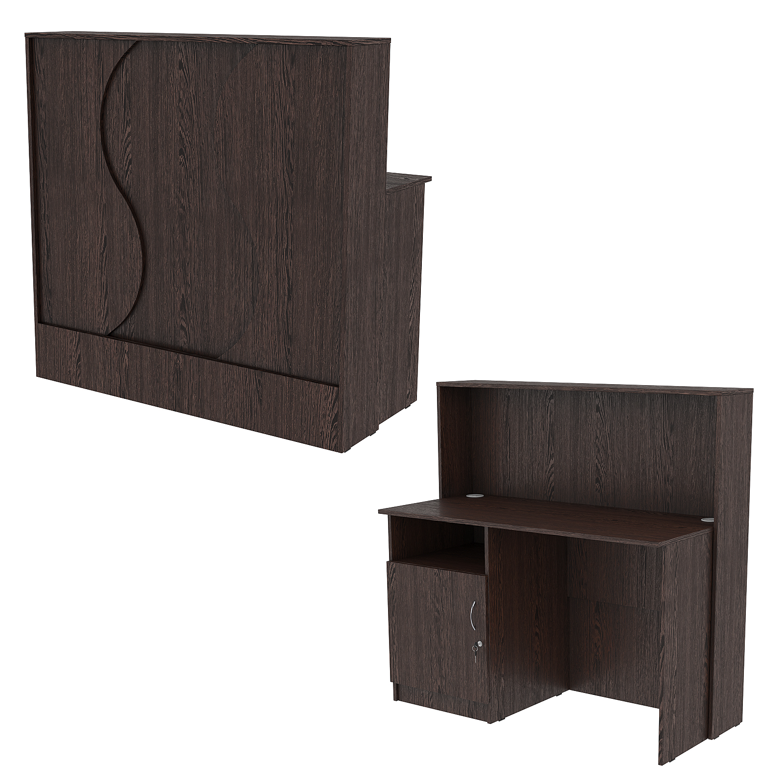 Конструкция состоит из двух предметов: стойки с верхней столешницей и рабочего стола администратора. Стол администратора содержит тумбу с тремя отделениями, расположенную слева. Верхнее отделение — открытое, остальные закрыты дверью. Каркас выполнен из ЛДСП темного тона. Фасад отделан ЛДСП панелью, имитирующей волну океана. Материал обладает приятными тактильными свойствами и рельефной фактурой.