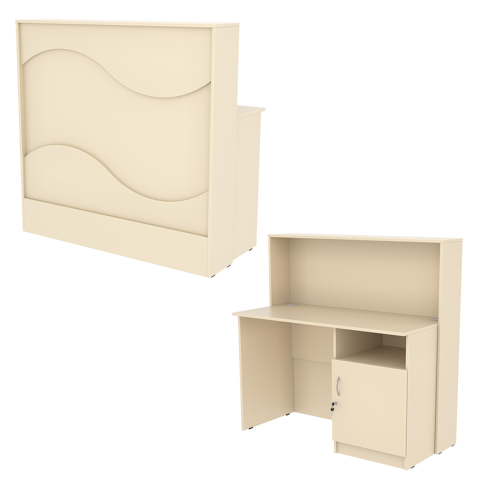 Конструкция состоит из двух предметов: стойки с верхней столешницей и рабочего стола администратора. Стол администратора содержит тумбу с четырьмя отделениями, расположенную справа. Верхнее отделение — открытое, остальные закрыты дверью. Каркас выполнен из ЛДСП темного тона. Фасад отделан ЛДСП панелью, имитирующей волну океана. Материал обладает приятными тактильными свойствами и рельефной фактурой.
