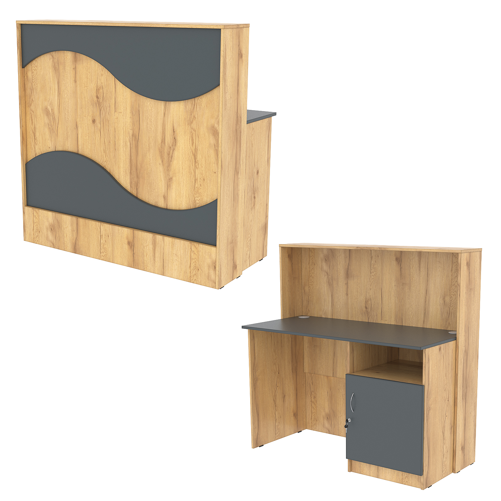 Конструкция состоит из двух предметов: стойки с верхней столешницей и рабочего стола администратора. Стол администратора содержит тумбу с четырьмя отделениями, расположенную справа. Верхнее отделение — открытое, остальные закрыты дверью. Каркас выполнен из ЛДСП темного тона. Фасад отделан ЛДСП панелью, имитирующей волну океана. Материал обладает приятными тактильными свойствами и рельефной фактурой.
