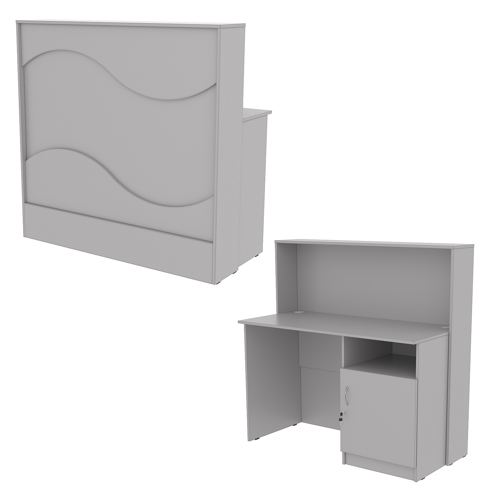Конструкция состоит из двух предметов: стойки с верхней столешницей и рабочего стола администратора. Стол администратора содержит тумбу с четырьмя отделениями, расположенную справа. Верхнее отделение — открытое, остальные закрыты дверью. Каркас выполнен из ЛДСП темного тона. Фасад отделан ЛДСП панелью, имитирующей волну океана. Материал обладает приятными тактильными свойствами и рельефной фактурой.