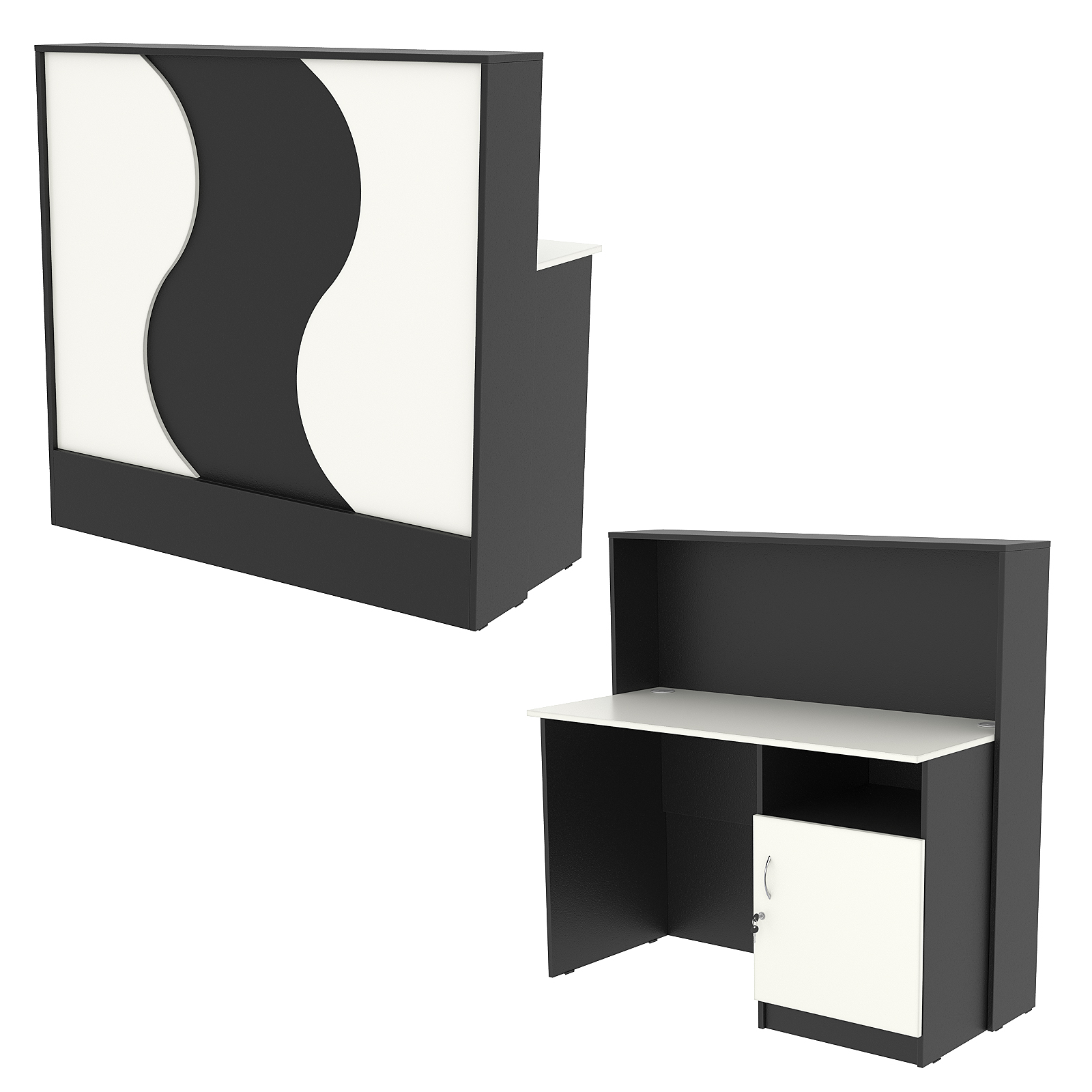 Конструкция состоит из двух предметов: стойки с верхней столешницей и рабочего стола администратора. Стол администратора содержит тумбу с тремя отделениями, расположенную справа. Верхнее отделение — открытое, остальные закрыты дверью. Каркас выполнен из ЛДСП темного тона. Фасад отделан ЛДСП панелью, имитирующей волну океана. Материал обладает приятными тактильными свойствами и рельефной фактурой.