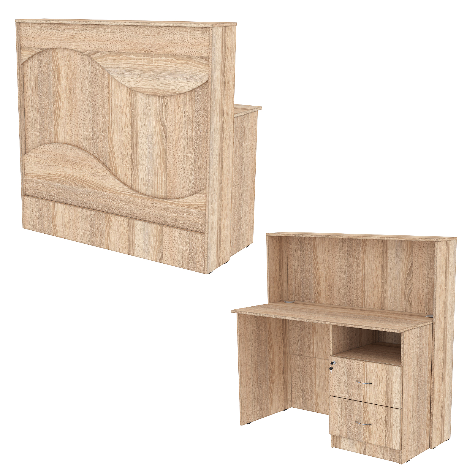 Конструкция состоит из двух предметов: стойки с верхней столешницей и рабочего стола администратора. Стол администратора содержит тумбу с тремя выдвижными ящиками, расположенную справа. Под столешницей имеется небольшое открытое отделение. Каркас выполнен из ЛДСП темного тона. Фасад отделан ЛДСП панелью, имитирующей волну океана. Материал обладает приятными тактильными свойствами и рельефной фактурой.