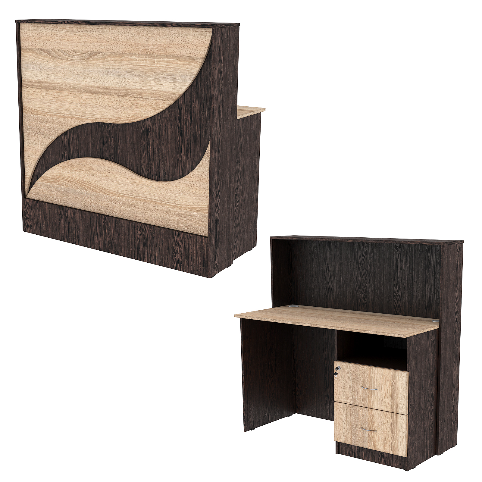 Конструкция состоит из двух предметов: стойки с верхней столешницей и рабочего стола администратора. Стол администратора содержит тумбу с тремя выдвижными ящиками, расположенную справа. Под столешницей имеется небольшое открытое отделение. Каркас выполнен из ЛДСП темного тона. Фасад отделан ЛДСП панелью, имитирующей волну океана. Материал обладает приятными тактильными свойствами и рельефной фактурой.
