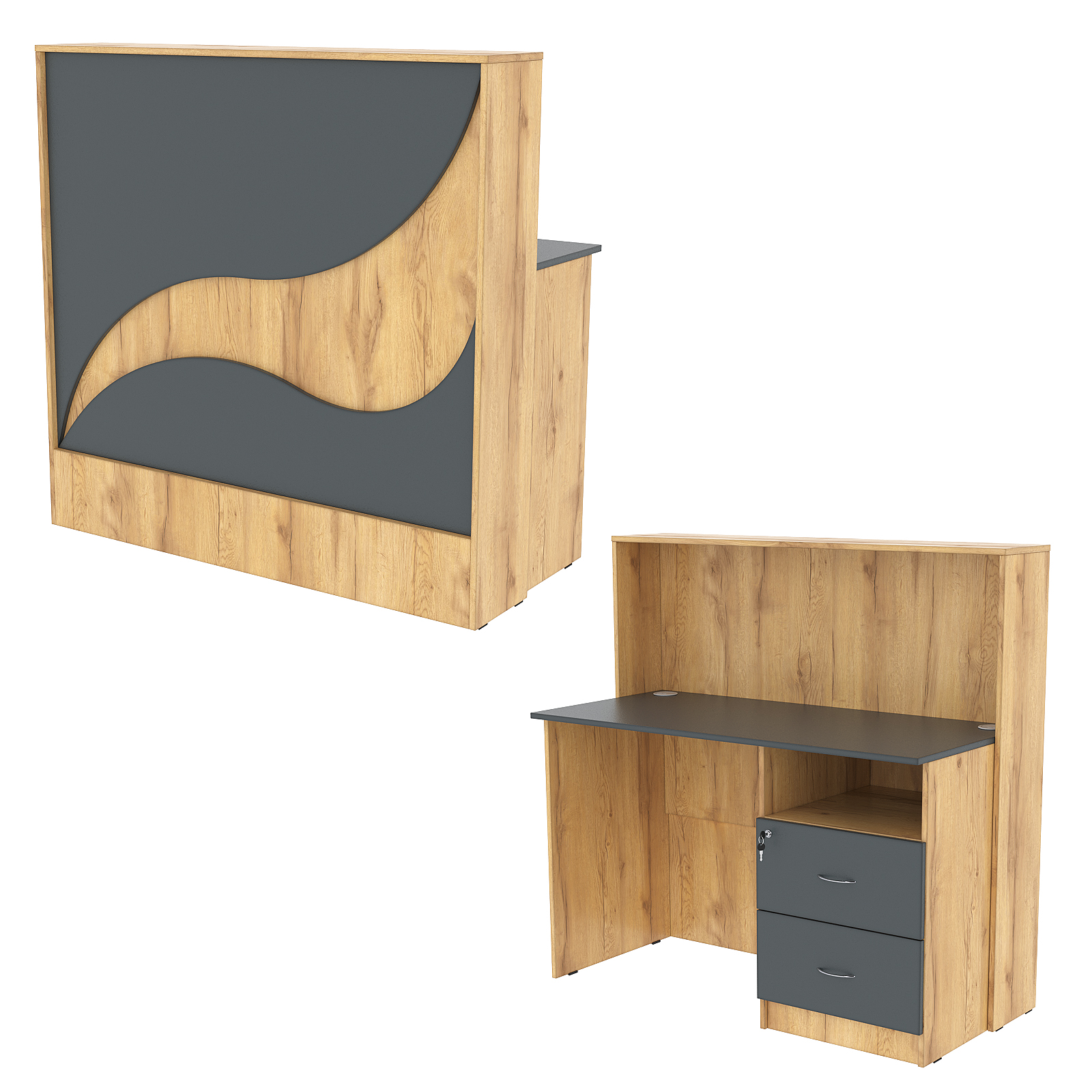 Конструкция состоит из двух предметов: стойки с верхней столешницей и рабочего стола администратора. Стол администратора содержит тумбу с тремя выдвижными ящиками, расположенную справа. Под столешницей имеется небольшое открытое отделение. Каркас выполнен из ЛДСП темного тона. Фасад отделан ЛДСП панелью, имитирующей волну океана. Материал обладает приятными тактильными свойствами и рельефной фактурой.
