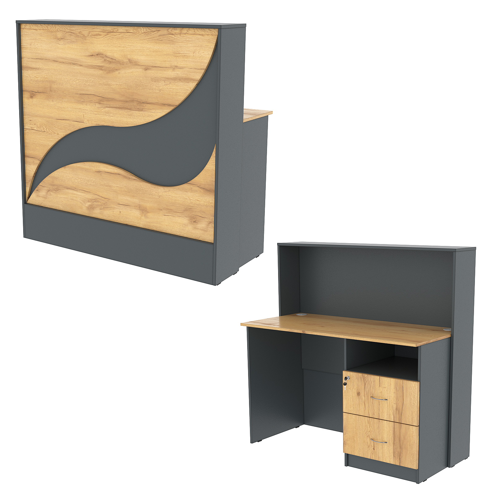 Конструкция состоит из двух предметов: стойки с верхней столешницей и рабочего стола администратора. Стол администратора содержит тумбу с тремя выдвижными ящиками, расположенную справа. Под столешницей имеется небольшое открытое отделение. Каркас выполнен из ЛДСП темного тона. Фасад отделан ЛДСП панелью, имитирующей волну океана. Материал обладает приятными тактильными свойствами и рельефной фактурой.