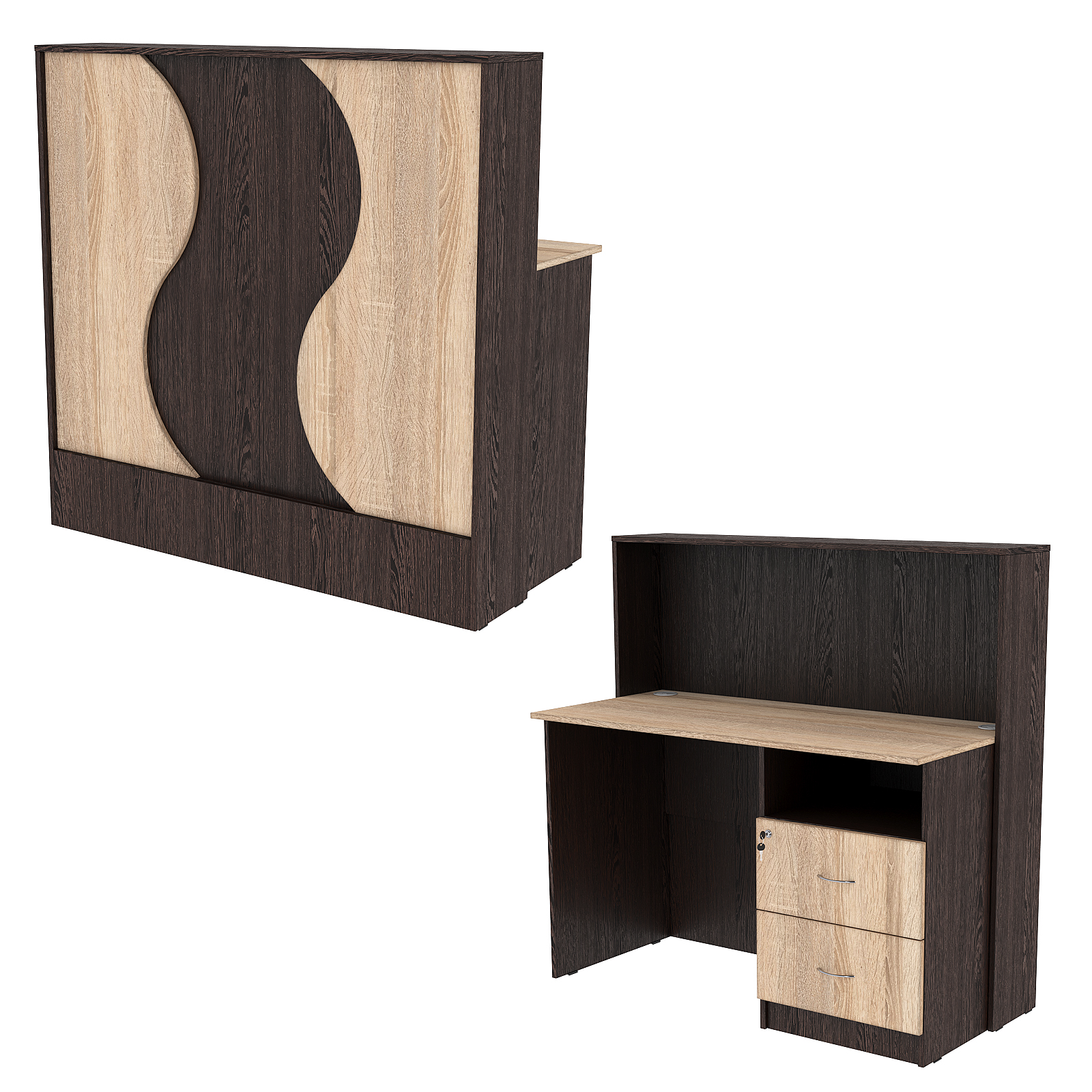 Конструкция состоит из двух предметов: стойки с верхней столешницей и рабочего стола администратора. Стол администратора содержит тумбу с тремя выдвижными ящиками, расположенную справа. Под столешницей имеется небольшое открытое отделение. Каркас выполнен из ЛДСП темного тона. Фасад отделан ЛДСП панелью, имитирующей волну океана. Материал обладает приятными тактильными свойствами и рельефной фактурой.